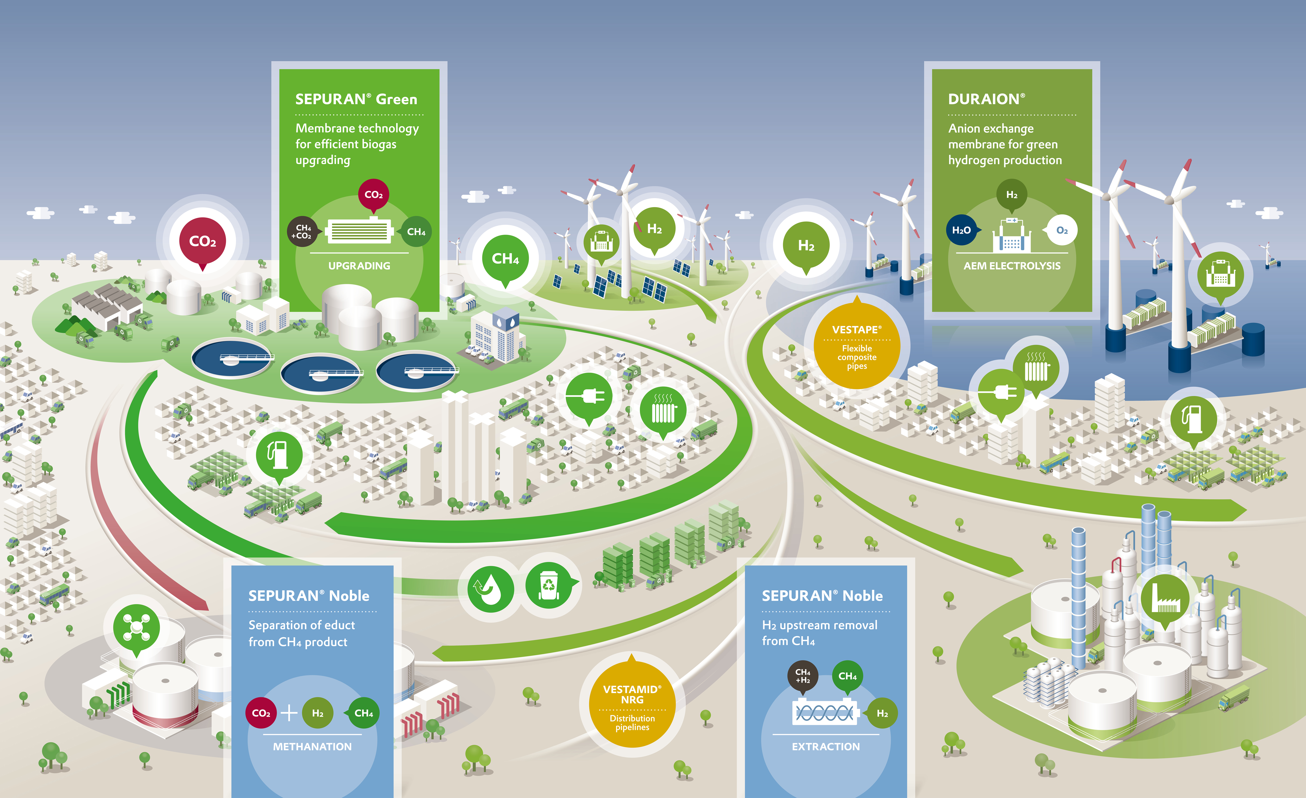 Evonik bündelt seine Membranaktivitäten in einem der sechs Innovationswachstumsfelder. Der Konzern hat innerhalb einer Dekade einen globalen Technologieführer für Membranen zur Gasseparation geformt. Mittels SEPURAN® Hohlfasermembranen gelingt es, Gase wie Methan (CH4), Stickstoff (N2) oder Wasserstoff (H2) besonders effizient aus Gasgemischen abzutrennen. Die Vorteile der Membrantechnologie von Evonik liegen in der präziseren Trennung der Gase beziehungsweise in höherer Produktivität. SEPURAN® N2 Membranen für effiziente Stickstofferzeugung werden etwa zur Inertisierung von Flugzeugtanks eingesetzt. SEPURAN® Noble Membranen extrahieren den durch die Erdgaspipelines transportierten Wasserstoff punktuell an den H2 Abnahmestellen aus dem CH4/H2 Gasgemisch. SEPURAN® NG Membranen ermöglichen eine effiziente Erdgasaufbereitung aus Gasquellen mit hoher CO2 Konzentration. SEPURAN® Green Membranen ermöglichen eine effiziente Biogasaufbereitung aus organischen und zirkulären Substraten.